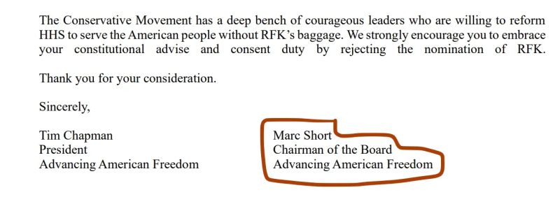 In a letter addressed to Republican Senators, AAF President Tim Chapman and Board Chairman Marc Short state several “concerns” they have regarding the “nomination of Robert F. Kenndy Jr. (RFK)” (sic) to head HHS, such as his views on vaccines, psychedelics, and abortion.