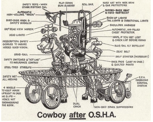 In the case of cowboy safety, for example, the California-style approach illustrated below might be appropriate for a state that lost its cowboys long ago, anyway. But Texas, which still has some, might well prefer a more practical and less burdensome approach.