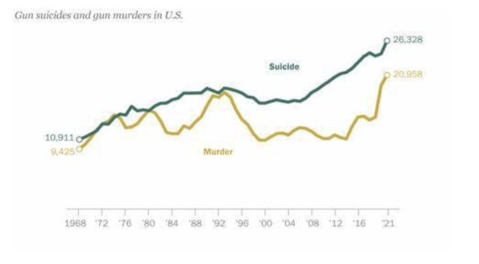 Likewise, its $500 million budget for “firearms enforcement” is just a polite term for the administration of gun control laws, which self-evidently don’t control much of anything. Thus, the number of deaths–both suicide and homicides–due to guns has more than doubled from 20,336 in 1968 to 47,284 in 2021, which translates to rates of 10.1 per 100,000 population in 1968 and 14.1 per 100,000 in 2021. So much for the ATF’s enforcement prowess.