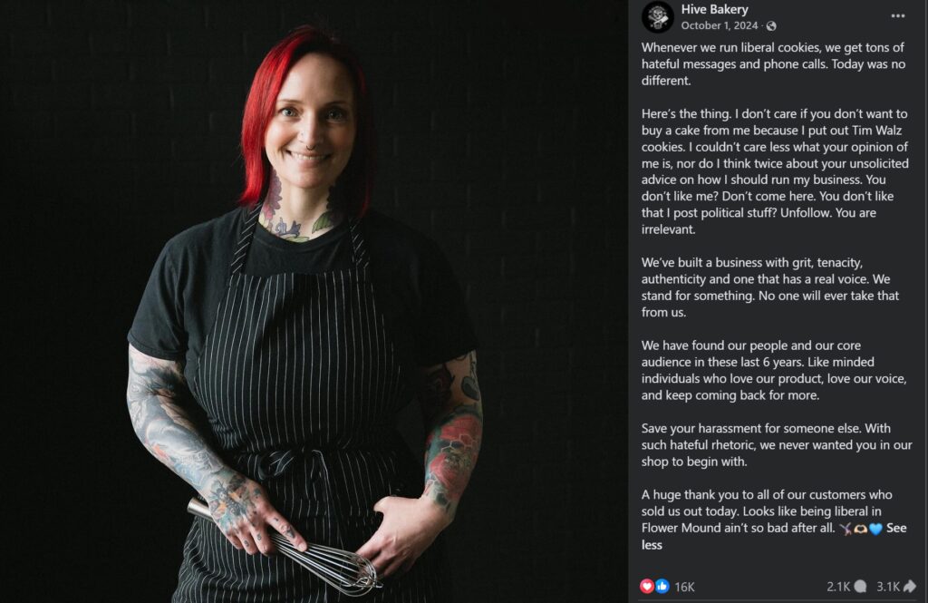 Here’s the thing. I don’t give a f– if you don’t want to buy a cake from me because I put out Tim Walz cookies. I couldn’t care less what your opinion of me is, nor do I think twice about your unsolicited advice on how I should run my business. You don’t like me? Don’t come here. You don’t like that I post political s–t? Unfollow. You are irrelevant.