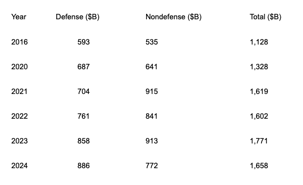 Thus, in nominal terms, combined defense and nondefense appropriations have risen by 47% since FY 2016—from $1.128 trillion to $1.658 trillion in FY 2024. As shown in the table below, about 40% of that gain came on Trump’s watch and 60% under Biden.