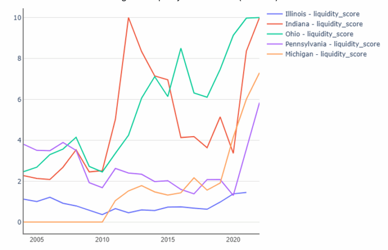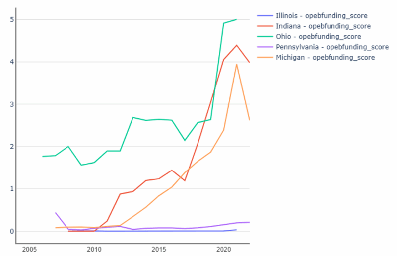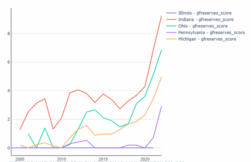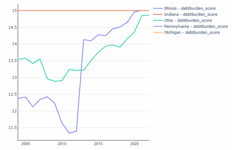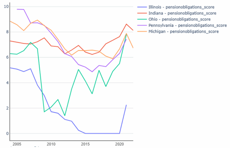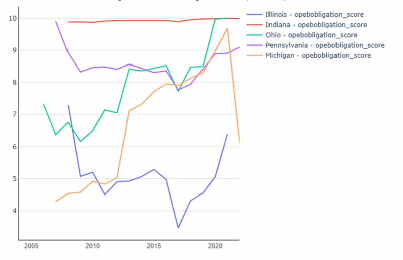 This section will compare Illinois to neighboring Indiana as well as Ohio, Pennsylvania, and Michigan (chosen for similar population size, median household income, and poverty rates). The fiscal strength score measures along ten different variables: reserve position score, debt burden score, liquidity position score, revenue growth score, pension obligation score, pension funding score, pension contribution score, OPEB obligation score, OPEB funding score, and Net Worth Score. The score descriptions and weighting are available in the Appendix.