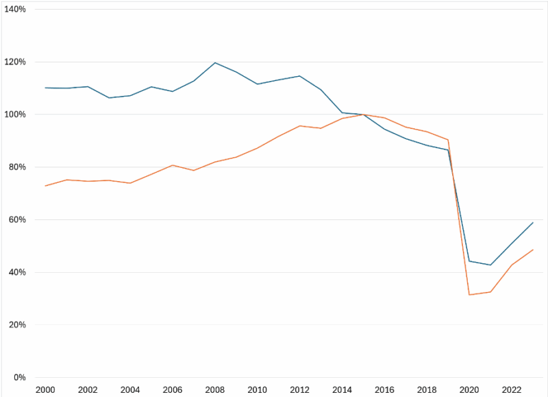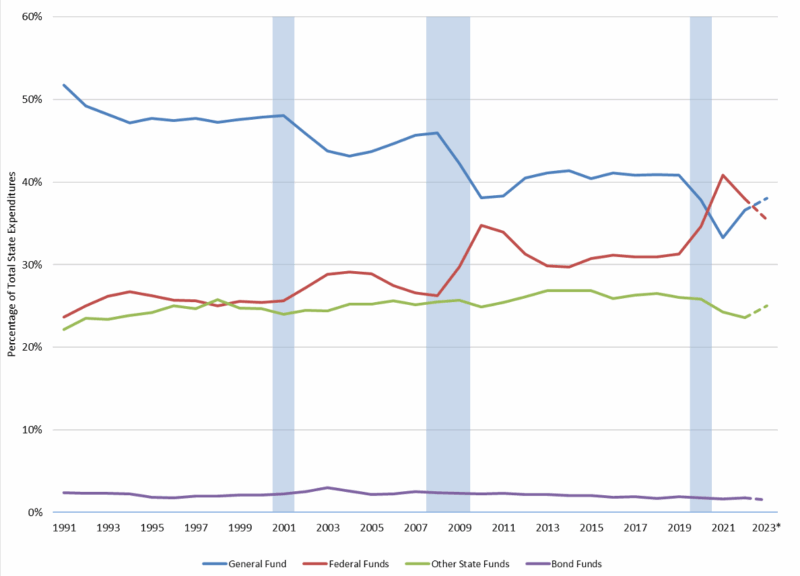 Sources: Earle and Savidge, “Fiscal Federalism Turned Upside Down,” National Association of State Budget Officers (NASBO) State Expenditure Report 2023, and NASBO State Expenditure Report Historical Data.