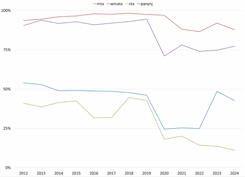[80] The “New York City Transit Crisis” beginning in 2017 occurred as numerous MTA services (especially the NYC Subway System) suffered from declining revenue, signal slowdowns, and degrading infrastructure. For a brief summary and subsequent issues after 2020, see: Stephen Nessen and Ramsey Khalifeh, “A State of Collapse: How the MTA Put Riders on the Fast Track to Ruin,” Gothamist, January 13, 2025, https://gothamist.com/news/a-state-of-collapse-how-the-mta-put-riders-on-the-fast-track-to-ruin.