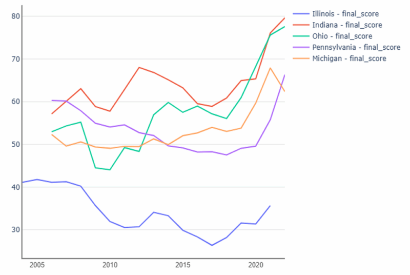 Prior to COVID-19, Illinois was facing severe financial troubles; COVID-19 response and the economic shutdown accelerated the process.[37] Illinois had already been facing a fiscal crisis due to decades of irresponsible fiscal policy, and its credit ratings have been teetering just above junk status since 2017.[38] The Hoover Institution Municipal Finance Dashboard examines state entities with a fiscal strength score based on criteria related to revenue, expenditures, debt, and pension and Other Post Employment Benefits (OPEB).[39] For all years 2006-2022, Illinois ranked among the states with the worst fiscal health. Figure 2 shows the overall fiscal strength of rankings of the State of Illinois, compared to similar states.