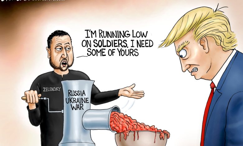 A.F. Branco Cartoon – Zelensky would like to see U.S. troops in Ukraine but is unwilling to move toward peace. Trump is seeking a path…